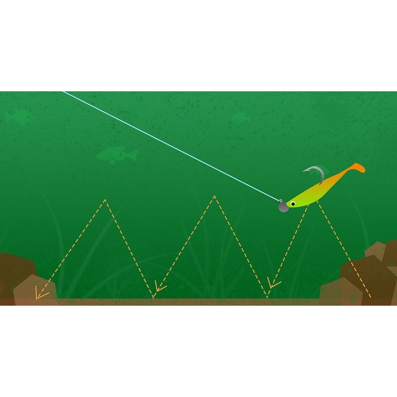 For fiske mest mulig effektivt med en jigg sls/lftes stangtoppen opp under innsveiving slik at jiggen danser langs bunnen som vist p bildet.