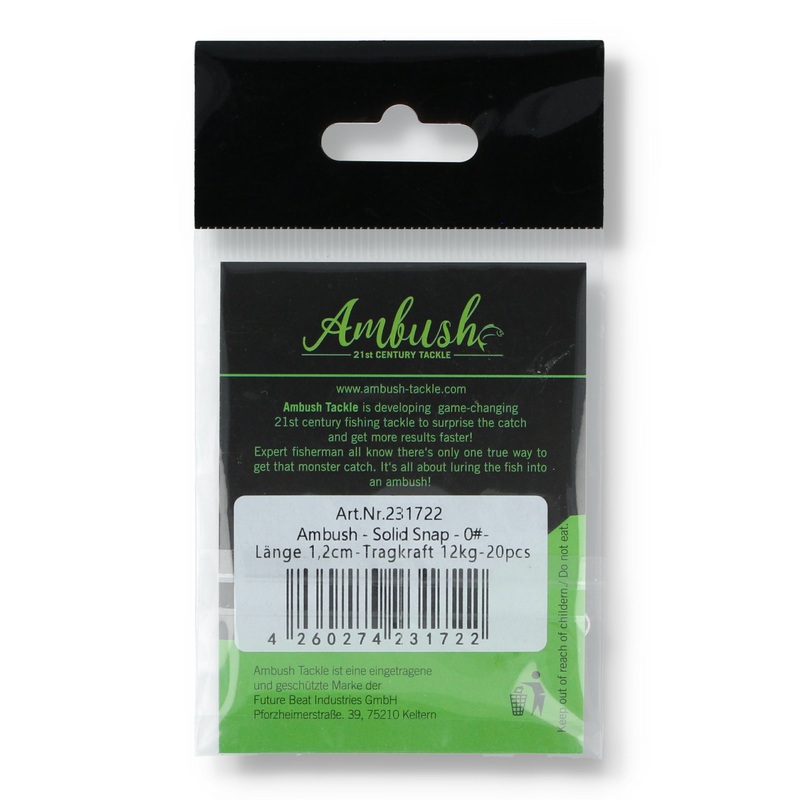 Die Ambush Tackle Solid Snaps zeichnen sich durch ihre robuste Bauweise und die hohe Materialgte aus, was sie zuverlssig und langlebig macht. Die Solid Snaps von Ambush Tackle sind in der Gre Mini-Snaps erhltlich, die speziell fr das Light- und Ultra-Light-Fischen auf kleine Raubfische entwickelt wurden. Sie eignen sich besonders dann, wenn extrem kleine und leichte Snaps bentigt werden, um den natrlichen Lauf von kleinen und kleinsten Kunstkdern nicht zu beeintrchtigen.