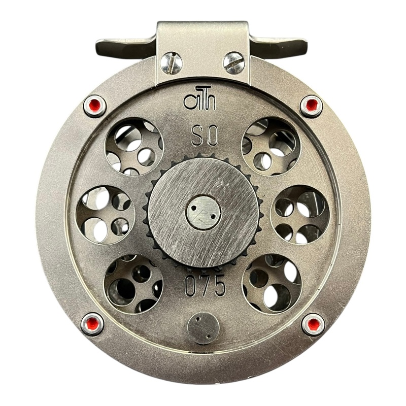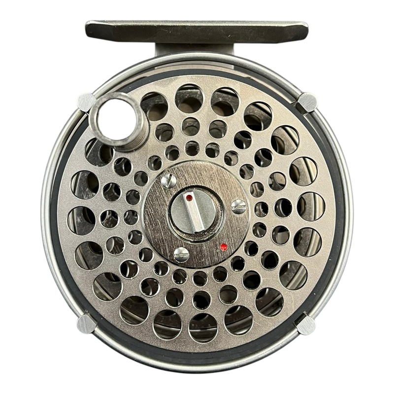 Very scarce nickel-plated, early model. Serial No. 075. Currently set up for R/H retrieve. A special wrench is required to disassemble, and we can get the retrieve changed for an additional fee.