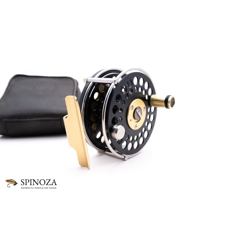 A nice Ari ‘t Hart Rio Orbigo F2 fly reel, 2 7/8″ diameter and set up for RHW. Made in Holland. Serial 4461. Excellent lightly used condition with some wear along the frame edge and minor cosmetic wear here and there. Black anodized spool with a gold anodized frame, and the logo and script in black on the backplate. Designed to hold up to a WF7 + 125 yds. Comes with the original black ATH leather case.