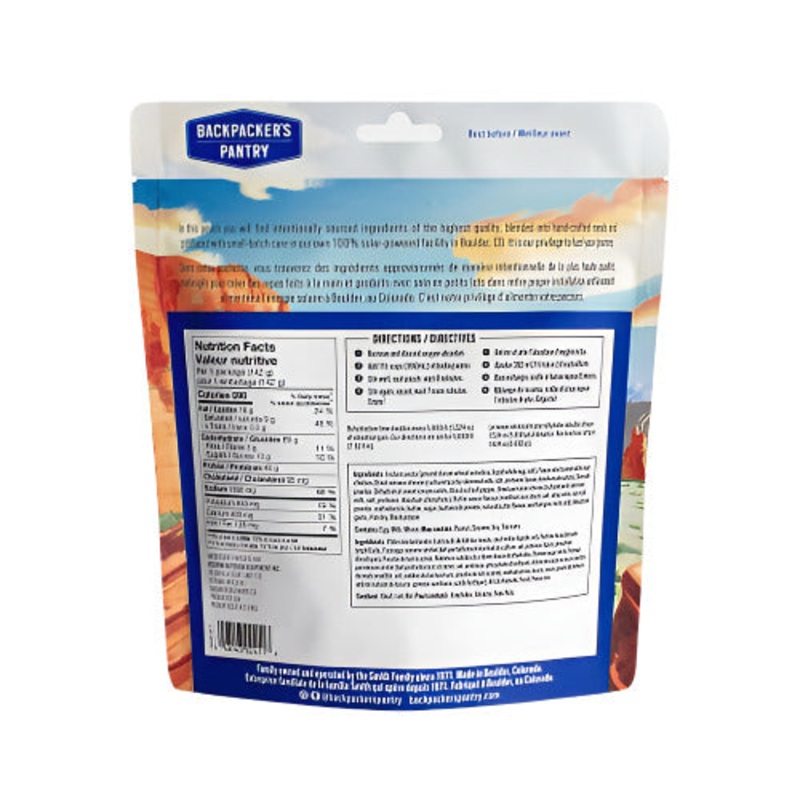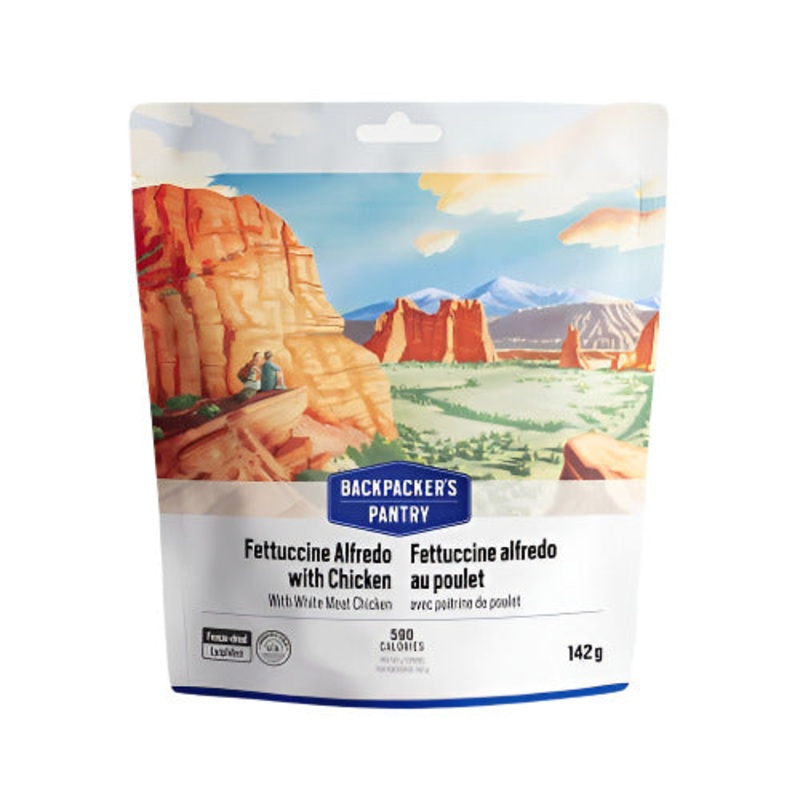 A classic Italian staple reimagined in a gourmet, freeze-dried camping meal version. Our hearty entre is protein-packed outdoor cuisine meticulously crafted with Belgian egg noodles made just for us, roasted red peppers, all-natural white chicken in a thick and creamy alfredo sauce. Its a trail-ready meal for foodies.