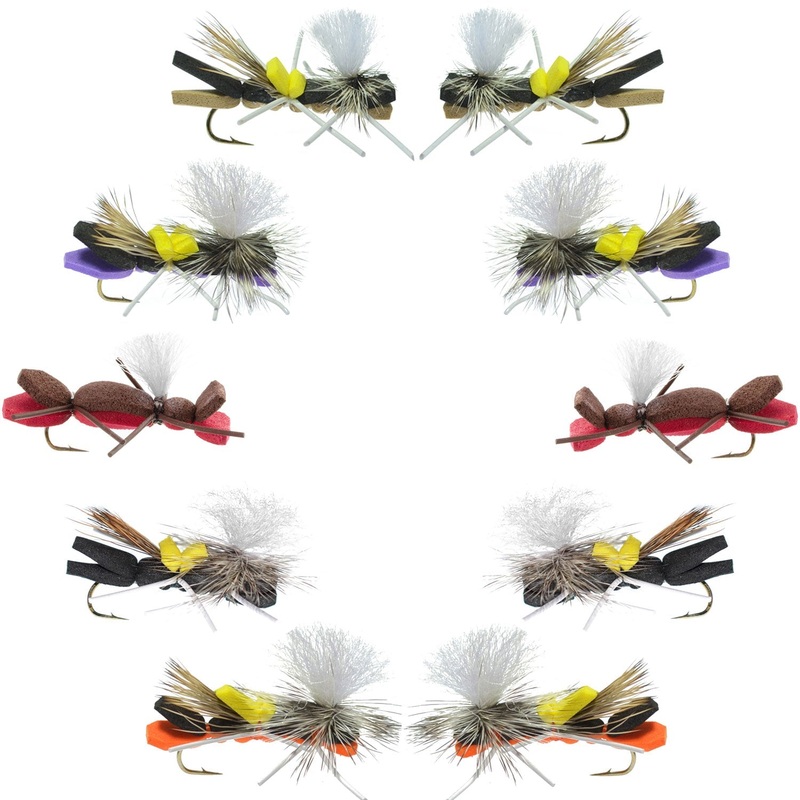 Basics Collection – Parachute Chernobyl Ant Foam Dry Fly Assortment – 10 Dry Fishing Grasshopper Dropper Flies – 5 Patterns – Hook Size 10