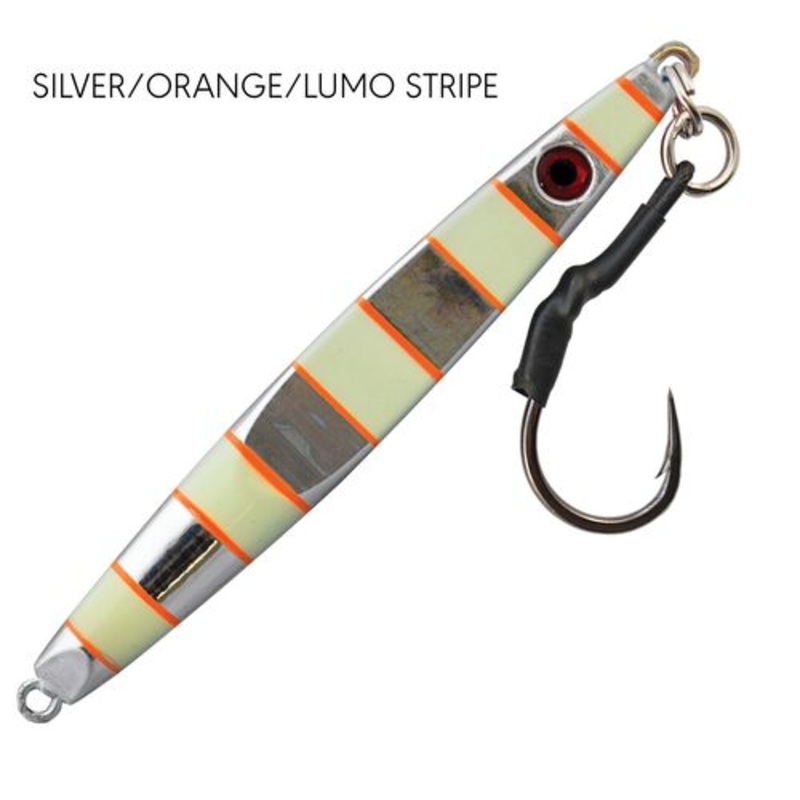Our Flutter jigs are designed to ‘flutter’ through the water column, due to the uneven profile with a low profile scoop out of one side. They’re ideal for fishing in fast currents and drifts. Whether fishing slowly with a lift and flutter technique or dead sticking in a current, the balance and shape of the jig produces a flutter that’s irresistible to fish. These metal jigs are ideal for targeting everything from trout and mackerel to snapper and kingfish. Our jigs come in holographic colours with UV belly strips or stripes, and are pre-rigged with an extra strong 5/0 or 7/0 assist hook.