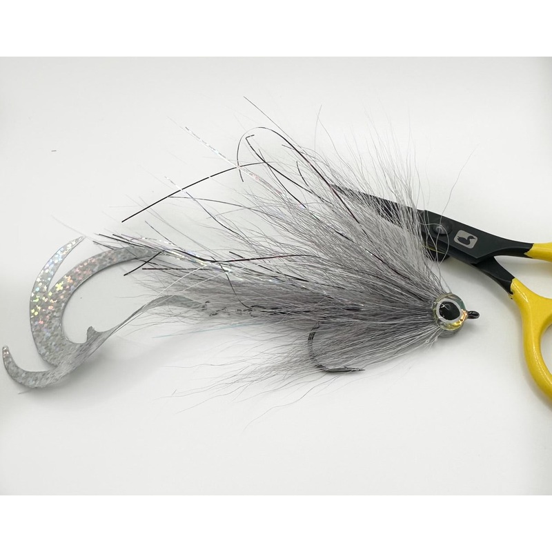 Blended Gray/WhitePike Fly anda Holographic Silver Pacchiarini Dragon Tail with a quick clip to replace or change color of wiggle tail.