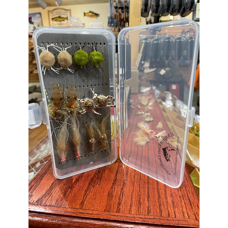 An excellent collection of CRO hand-picked shrimp and crab flies to target bonefish and permit. It includes 6 patterns, sizes and colors are subject to slight variation from the posted image. Includes CRO fly box. 12 flies, 6 crabs and 6 shrimp flies, two for each of the patterns.