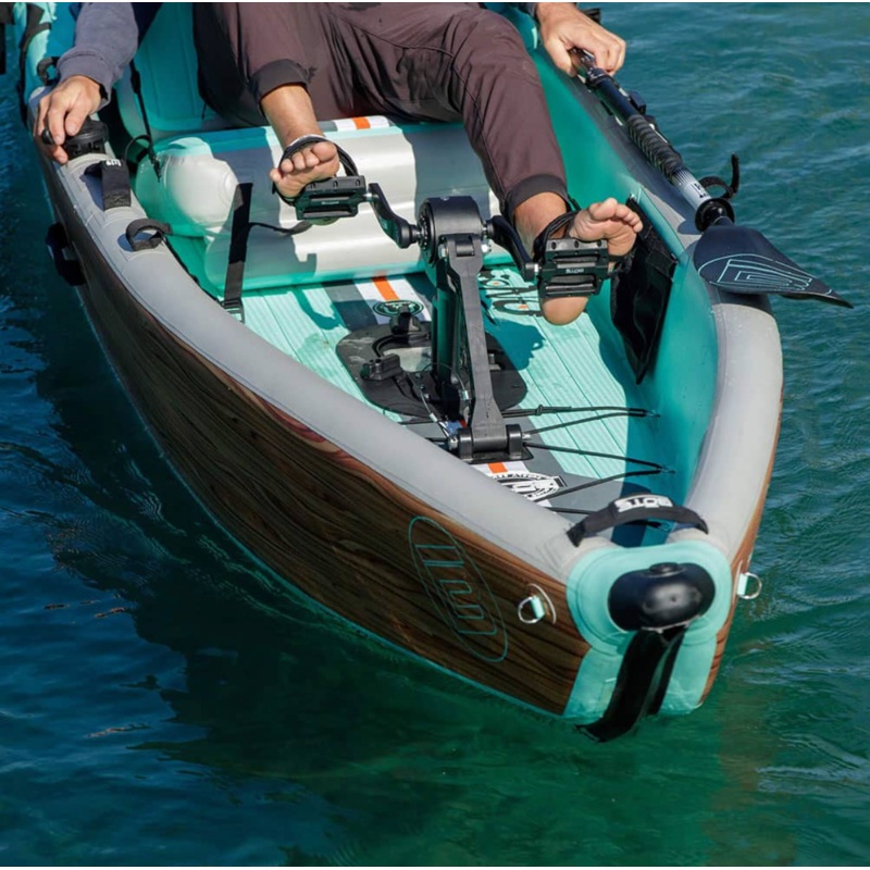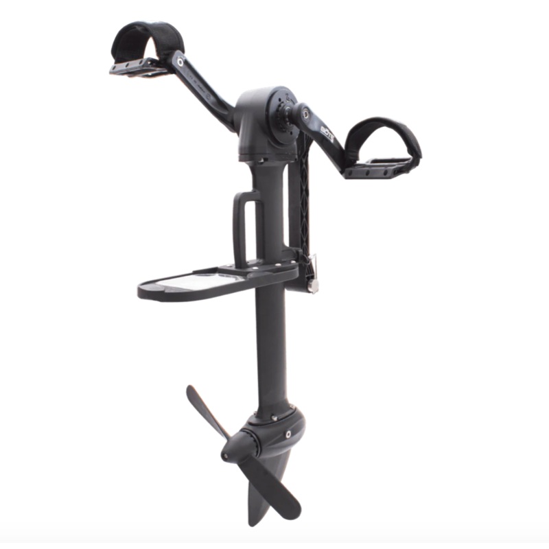 The APEX Pedal Drive is a hands-free, pedal-powered system. The APEX has a 10:1 gear ratio for smooth, efficient pedaling as well as wide pedal foot platform with comfortable straps, a clear viewing port-hole, no-touch forward and reverse, and a spring-loaded, kick-up rudder to prevent damage.