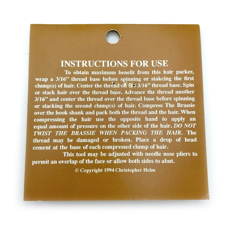 To obtain maximum benefit from this hair packer, wrap a 3/16″ thread base before spinning or stacking the first clump(s) of hair. Center the thread on the 3/16″ thread base. Spin or stack hair over the thread base. Advance the thread another 3/16″ and center the thread over the thread base before spinning or stacking the second clump(s) of hair. Compress the Brassie over the hook shank and pack both the thread and the hair. When compressing the hair use the opposite hand to apply an equal amount of pressure on the other side of the hair. DO NOT TWIST the Brassie when packing the hair. The thread may be damaged or broken. Place a drop of Flexible Head Cement at the base of each compressed clump of hair.