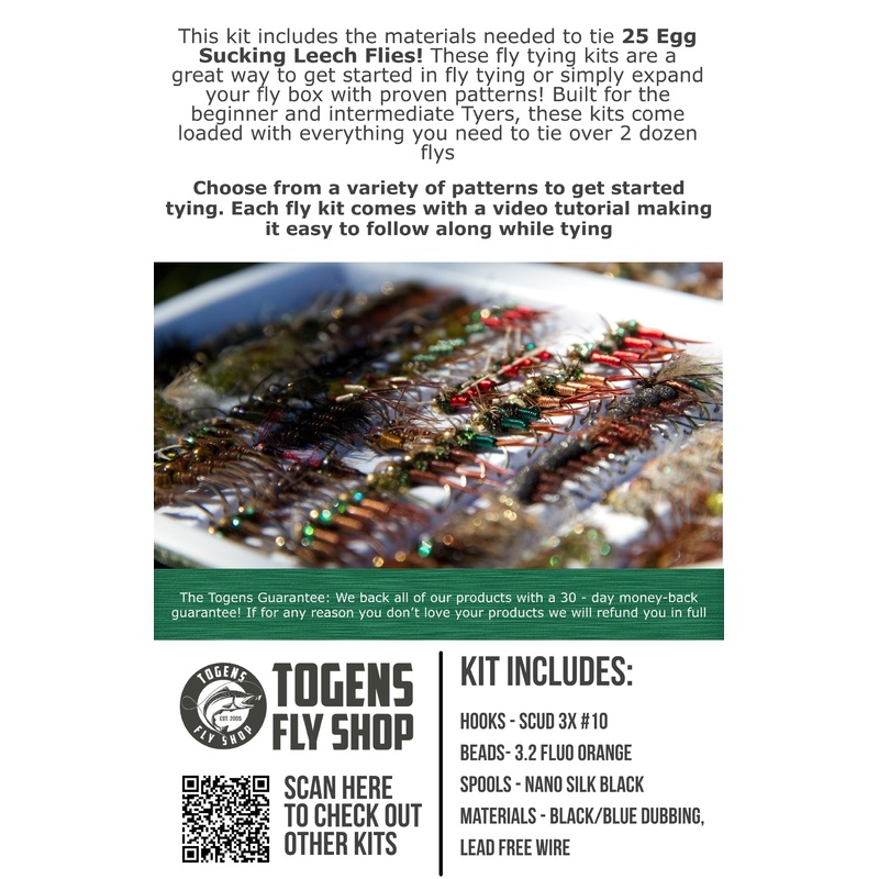 This kit includes the materials needed to tie 25 of the Bruised Egg Sucking Leech a bold, fish-attracting pattern thats deadly in a variety of conditions! These fly tying kits are a great way for you to get started in fly tying or simply add proven patterns to your fly box. Built for beginner and intermediate tyers, these kits come loaded with everything you need to tie a dozen flies of each pattern.
