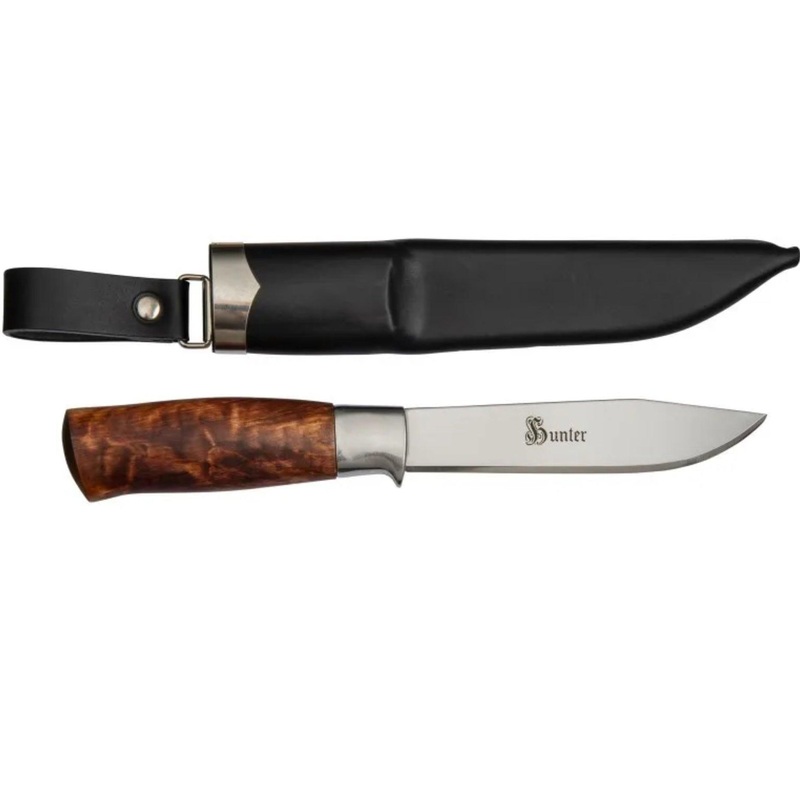 Alt fra skjre brd til lage opptenningsved, til jakt eller slye fisk. Hunter er vr favoritt til allroundbruk. Knivbladet er et skandinavisk rettslipt knivblad. P toppen av sliren er det et metallbnd som gr rundt hele sliren. Stpt aluminiumsholk med fingerbeskytter, hvis du skulle vre uheldig og glippe kniven. Kniven er laget med 14116 stl i knivbladet, som er holdbart og enkelt slipe opp igjen. Skaftet er laget av oljet og beiset masurbjrk. Kniven leveres med en lrslire og en flott gave eske.