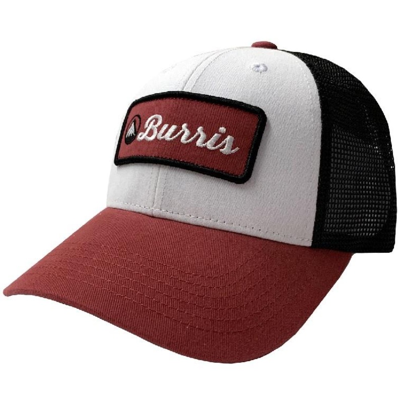Burris name and logo patch stitched on front of cap. A trucker style hat.