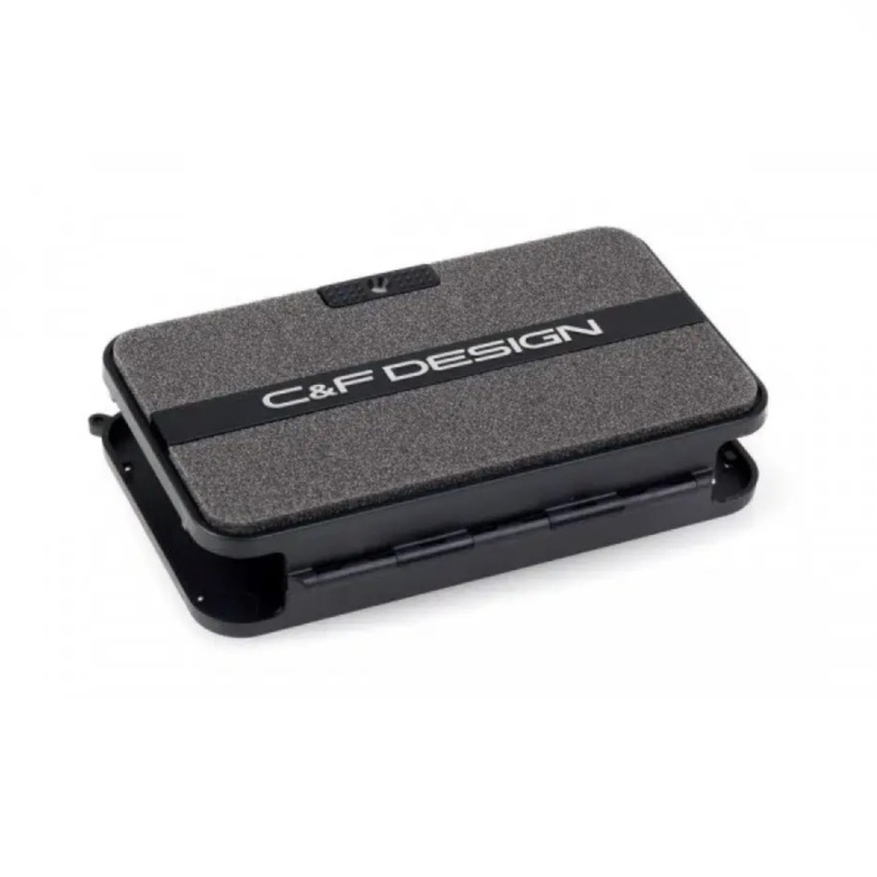 A fly patch with 5 rows of Micro Slit Foam in the base and 6 Neodymium Magnets in the vertical section used to hold flies while they dry. The back of this section has a pin to attach the patch to a garment. Also included are 2 snap hooks with rings that attach to each corner of the patch. The hooks can then be attached to D-rings on a vest or lanyard. The patch has large side gates at each end for ventilation. The C&F Design logo is embedded in the lid.