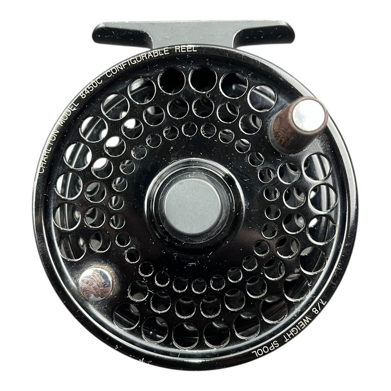 8450 configurable model with the 7/8 spool. There is a minor tweak on one side of the reel foot that does not affect how the reel seats on a rod. Some light scratches in the finish, but nothing serious. The drag knob is a bit tighter than other Charlton reels in our collection. Mechanically, the reel functions very well with no issues.