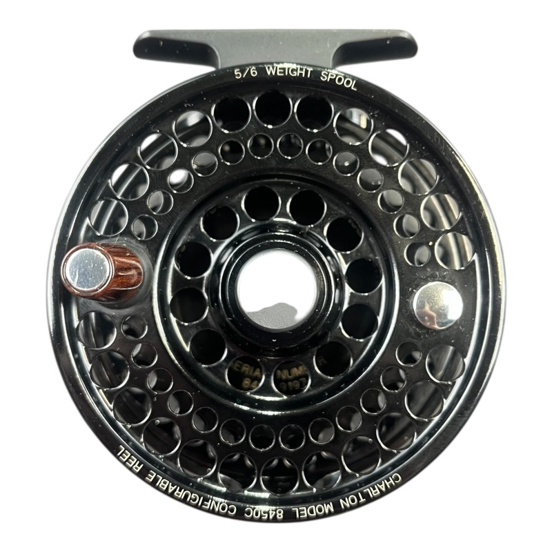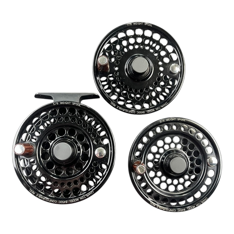 Charlton 8450C configurable reel with all three spool sizes (3/4, 5/6 and 7/8). All three components include their original factory box and blue canvas pouch. The reel box has the original owner’s information written on it in pen.