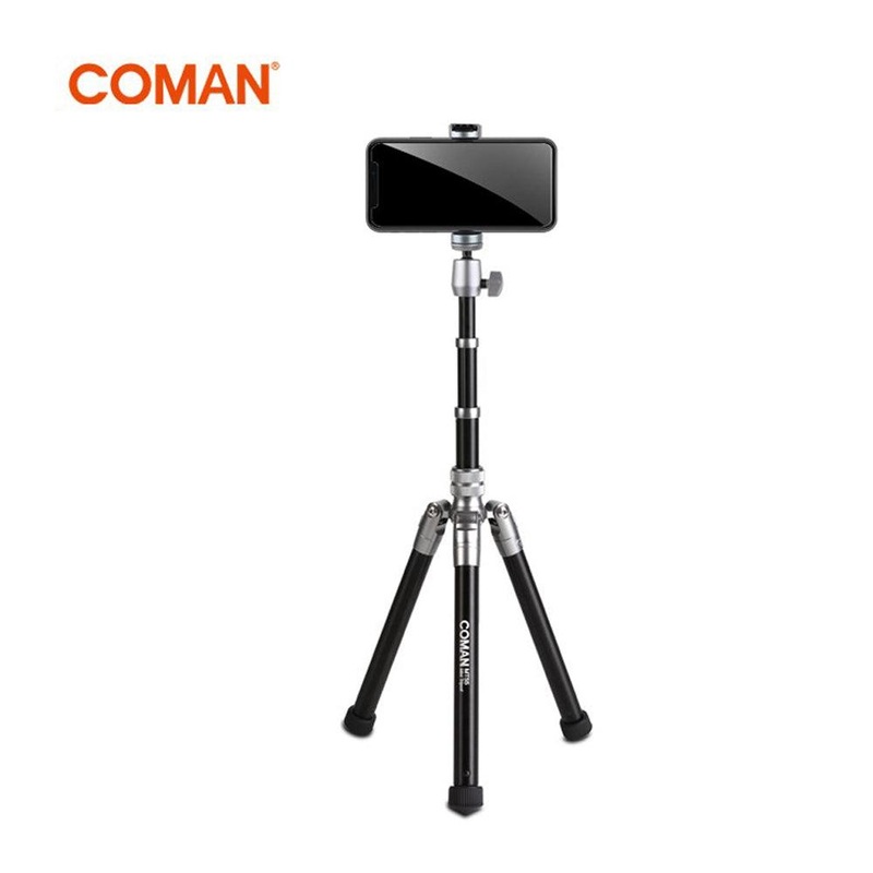 Et multifunksjonelt stativ fra Coman, som ogs fungerer som selfiestick. Hodet kan roteres 360 og tiltes 90.