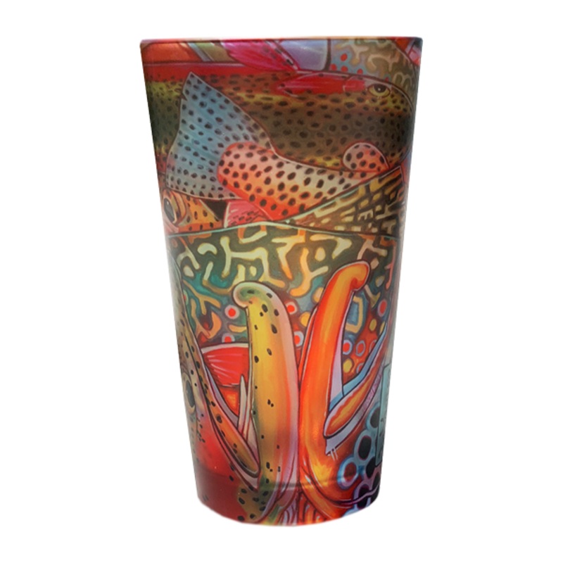 These heavy-duty 16 oz. Pilsner glasses feature Derek DeYoungs Trout Confetti Series in a vivid, fully wrapped printbringing fish art and functionality together in one sleek pour.