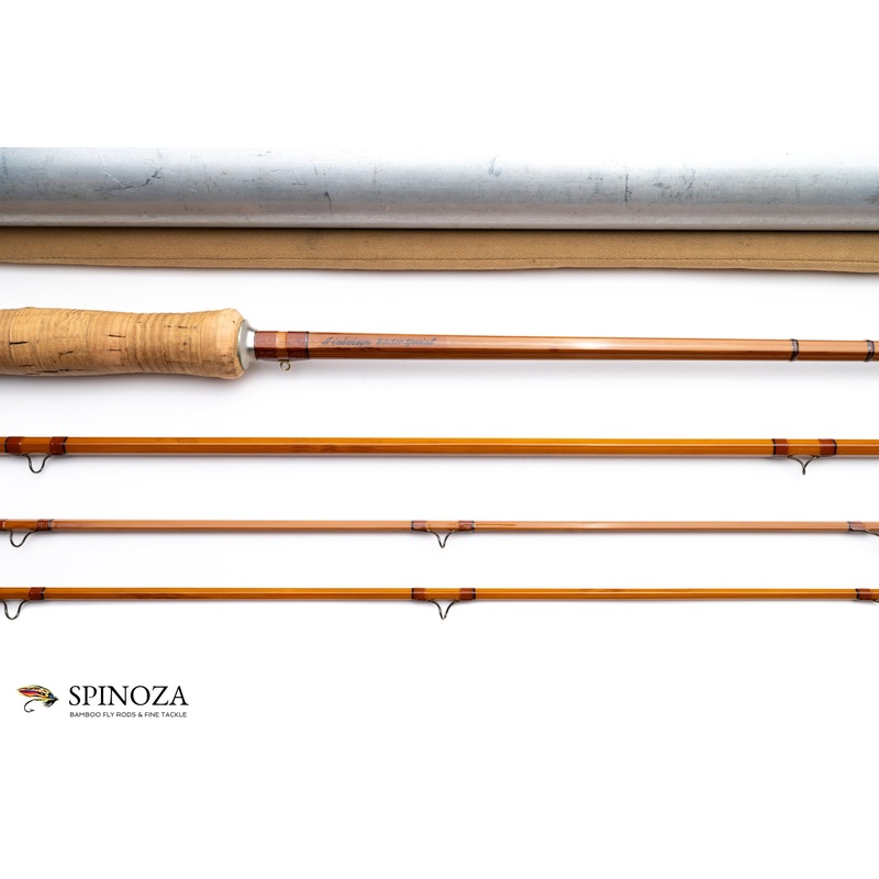 A Lyle Dickerson 801510 model bamboo fly rod, 8′, 3-piece, 2-tip, and built for a #5 line. The rod weighs 4.3 ounces on my scale. This rod has a slower action, certainly slower than the majority of Dickerson’s. The rod has been refinished and whoever did it did a very nice job and carefully preserved the Dickerson signature on the butt. Agate stripping guide. The snake guides show no sign of brassing and are likely part of the refinish, as the grip has been well-used and the reel seat has signs of use as well. The tip-tops are also not consistent with the original period. The main wraps are light tan with black edges. The step ferrules are oxidized. The grip is 5 1/2″ long, and was originally a full wells but has deteriorated a bit with age. The down lock screw-lock has the large light bulb threads more like F.E. Thomas than most of the Dickerson rods I have seen. The nickel silver pocket cap looks correct to me. The rod packs into a tan cloth bag and the tube looks original but is missing the correct top (some one machined a new top but the threads are not correct as it only goes on about 1/2 turn). Though not a collector-grade Dickerson this rod is still nonetheless a nice opportunity to take fishing, especially for those who generally don’t like very fast action rods.