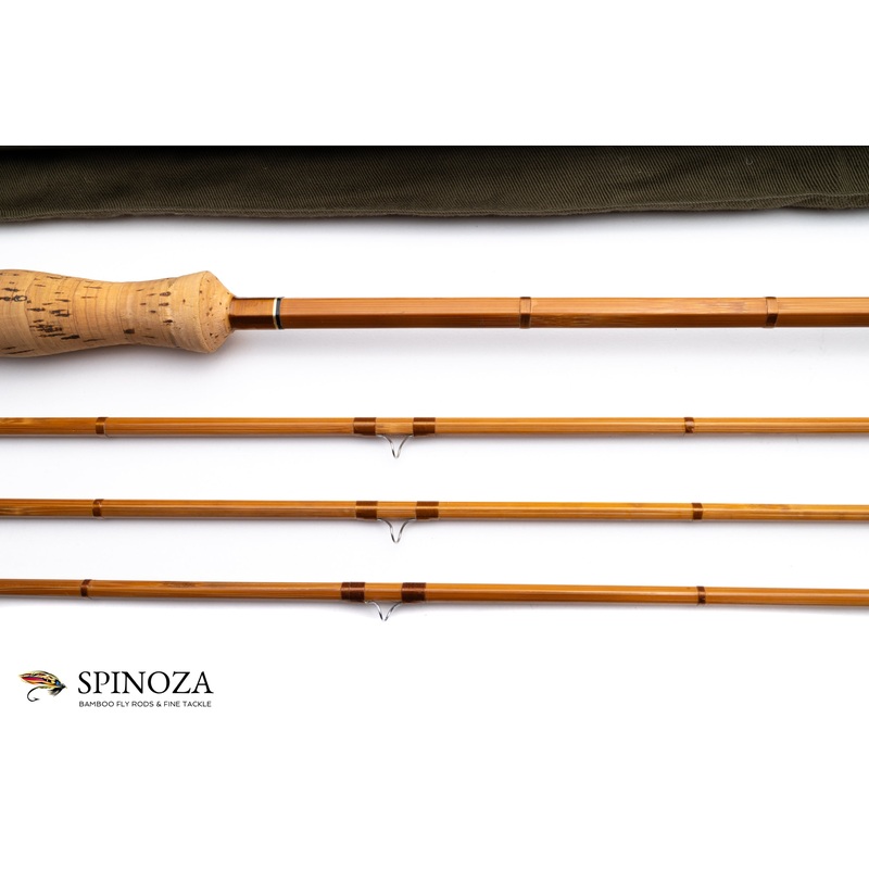 An E.C. Powell bamboo fly rod, 9′ 2-piece, 3-tip, and built for a #5 line. Refinished condition. Strong action. It has not been used much since the refinish and has just the beginning of casting cracks at the ferrule wraps. The refinish appears to be a light coat of oil finish and the brown wraps color preserved over that. Light caramel color cane with slightly darker nodes. Brown main wraps with a white/black edge. The three tips are all different from each other. One tip is .015″ smaller at the ferrule, while one of the two heavier tips is .005″ lighter at the tip top. The stripper is an agate and snakes are chrome. The ferrules are polished steps with the male one piece drawn. The grip is 6 1/4″ long and turned to a full wells profile with a hidden pocket cap. The seat has a black spacer and the uplocking screw lock has the “E.C. Powell, Maker, Marysville, CA” stamp on it. The grip is a bit rough from the cleaning. Original tube and bag.