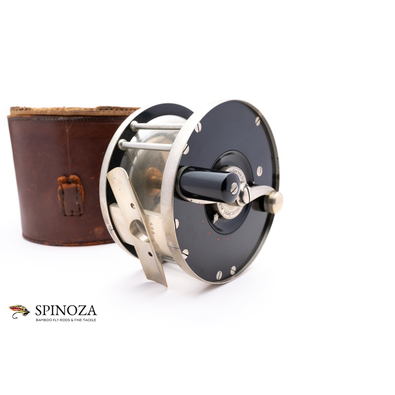 A nice Edward Vom Hofe 423 Restigouche salmon reel in 6/0 size, 4 1/4″ diameter and set up for the traditional RHW. This is a second version Restigouche with the ’79 patent dial adjuster and 7 detent arrowhead under the crank and the raised dome sliding click on the backplate. There is no serial number (which weren’t added until 1908). Excellent overall condition with some minor cosmetic wear only. There is some tarnish on the nickel silver rims in a few places as well as on the foot, but otherwise the reel is very clean. The frame and pillars are in great shape, as are the sideplates and screws. The foot is full length and unmolested. The reel has the ’83 patent date stamp on the oil cap. Mechanically the reel is nice and smooth with a strong drag. This is the original serpentine S-handle style reel and this is a very fine example. The reel comes in an original Vom Hofe leather case, though the facing on the lid has come off (it is tucked inside the case) and there is no strap to be found.