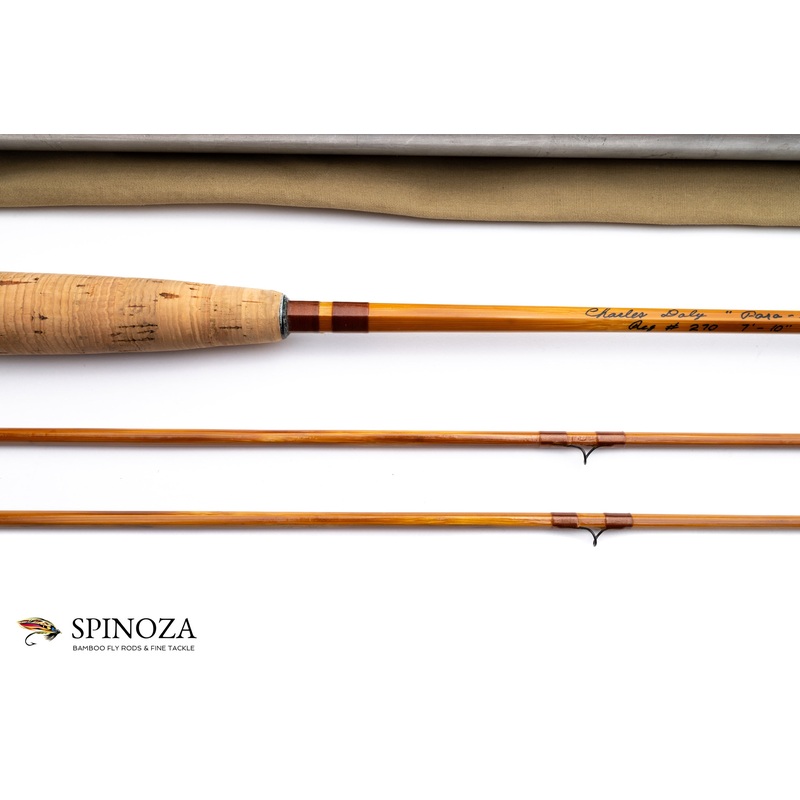 A Charles Daly “Para Taper” bamboo fly rod, 7’10”, 2-piece, 2-tip, and built for #5. Serial #270. The rod weighs 4.5 ounces on my scale. I believe this rod was made by Edwards for Charles Daly, the sporting goods retailer in Philadelphia. While I confess that I dont know a great deal about these models, I did find the taper for this rod quite attractive in the hand. Medium to medium-fast action. The rod has an Edwards-style seat and has been refinished, so there are ghost where prior guides have been repositioned. Light flamed cane in a light caramel color with lighter nodes. Brown wraps with no edge and two carbide strippers and black stainless snakes. The butt has a slight swell. The step ferrules are polished bright. The grip is 5 1/2″ long and shaped to a cigar profile. It has been cleaned, leaving it slightly ridged with a hidden pocket cap. Uplocking aluminum screw lock. The rod packs into a tan bag and aluminum tube.