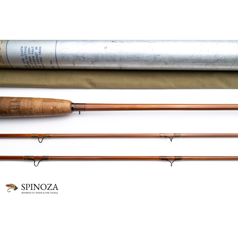 An E.F. Payne special bamboo fly rod, 7’9″, 2-piece, 2-tip, and built for a #5 line. The rod weighs 4.2 ounces on my scale. One tip is short. Medium to slowish action, it could possibly use a #4 line. The current owner relayed to us that this was originally owned by Frank Mele, the angler, writer, and bamboo aficionado who was friends with Jim. The rod has been re-wrapped with new antique paddle foot guides and over-varnished with an amber tinted varnish to “antique” the rod. The older varnish was partially sanded out but still left a few telltale chips partially filled. This process left a lighter streak along the corners of the rod shafts while muting the brown, yellow, and purple wraps. Also of note, the spacing of the wraps on the short tip does not match up with the full-length one and it has received the same “antiquing” treatment. The ferrule is the same size but I suspect the short tip may have been swapped in from a different rod. The ferrules are oxidized, the stripper is a red agate, and the snake guides are new. The grip is a 6″ long western with a hidden pocket cap. The seat is an aluminum up-lock screw-lock with the “Sold by Abercrombie & Fitch” stamp. The bag is original but the bottom is held closed with some black tape. The Payne tube is original but not for this rod. A label below the collar states: “Payne Special 7’9″ #5 2/2, 5oz. DL acorn seat” (the seat on this rod is an uplock).