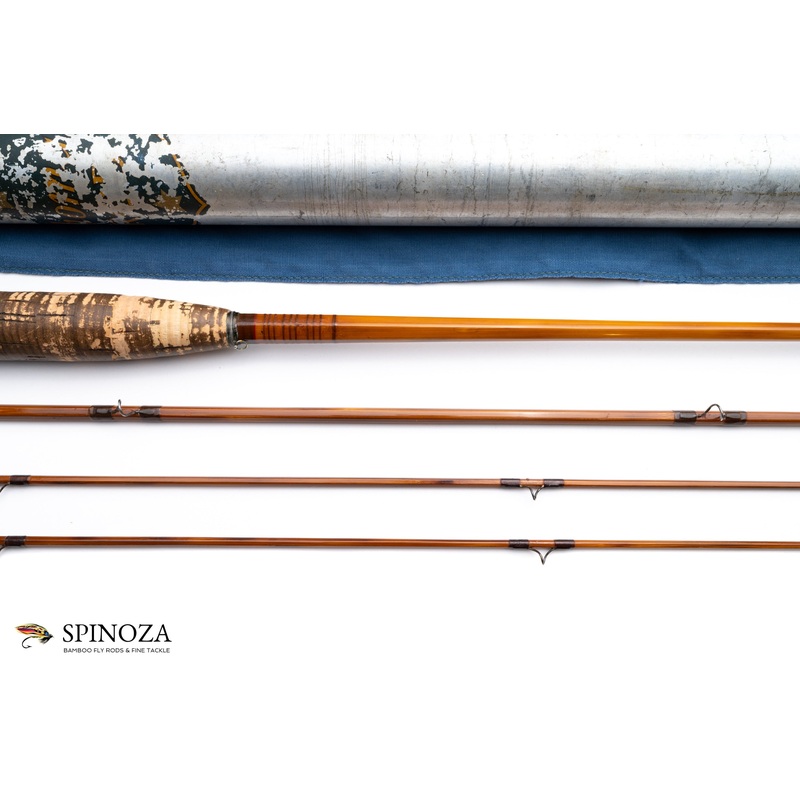 A nice FE Thomas Browntone bamboo fly rod, 7’6″, 3-piece, 2-tip, and built for what feels like a #3 or #4 line. Serial # F769. The rod weighs 3.3 ounces. Semi-full flexing action with fine tips. Good condition with only two small glancing hook strikes to the varnish of the mid-section. The grip is well tanned with a bit of ridging cork erosion. The keeper and hardware are oxidized. The cane is lightly flamed with a few darker patches. The main wraps are brown with red edges at the keeper and male ferrules. There are 3 windaways at the male ferrules. Perfection stripper and the snake guides go from left to right so they are American-style twist. The oxidized step ferrules fit well. The grip is 5 1/2″ in length and formed to a medium cigar. The flatted slide band seat looks like varnished Spanish cedar. The butt cap is pocketed and oxidized (retaining 90% of the oxidation), and stamped F.E. Thomas, Special, Bangor, ME in a cartouche. The rod packs into a blue cloth bag and aluminum tube with the F.E. Thomas brass hardware.
