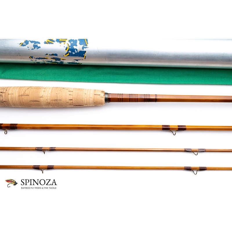An FE Thomas Browntone Special bamboo fly rod, 9′, 3-piece, 2-tip, and built for what feels to me like a #6. The rod weighs 5.5 ounces on my scale. H333 stamped on the butt cap. Fast action. Lightly used condition with very little brassing to the inner guides. The grip has been cleaned leaving it slightly ridged. The cane is flamed with darker patches here and there. Brown wraps with a perfection stripper and reverse twist snakes. 3-6-3-1 signature wraps. The varnish would be excellent but for some slight bag impressions. Oxidized step ferrules. The grip is 6″ long and shaped to a blunt cigar profile. As stated, it has been cleaned leaving it slightly ridged. The seat is the standard Thomas aluminum downlocking screwlock. The nickel silver pocket cap is oxidized with some edgewear. The stamp reads “FE Thomas Special / Bangor ME”. The rod packs into a green cloth bag with the original hang tag and an aluminum tube with brass fittings. About 20% of the FE Thomas shield decal remains intact. The rod also comes with a certificate of registration.