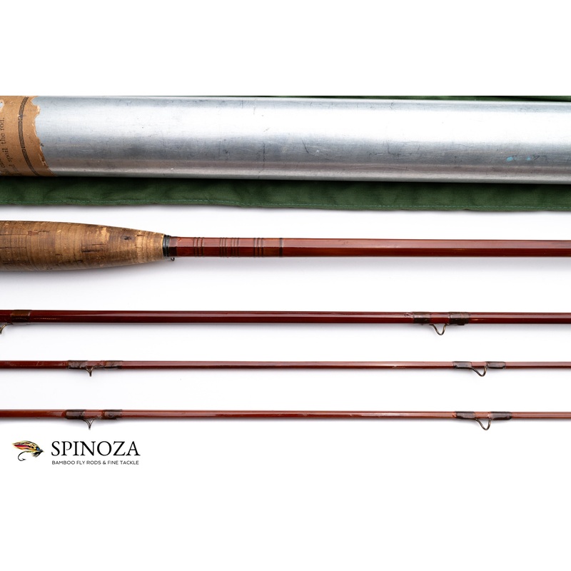 An F.E. Thomas Mahogany bamboo fly rod, 9′, 3-piece, 2-tip, and built for what feels to me like a #4 or #5 line. Serial #30. Very fine tips with a wet fly action. Dark oven temper cane with darker nodes. Brown wraps with an agate stripper. Reverse twist snake guides. Ferrules and seat hardware are anodized jet black. The varnish is good with a few chips here and there. There is a bit of excess varnish flowing off the wraps (was it given a possible overcoat?). 3, 3, 3, 3 + 1 signature wraps. The keeper ring is pinned to the front cork check one flat right. The 5 1/2″ slim cigar grip is well tanned with hand soiling. The all-cork seat features an oxidized ring and pocket cap. The pocket cap is stamped “30” and “F.E. Thomas Special Bangor, ME.” The ring retains 95% of the oxidation and the cap 85%, mostly due to edge wear. The ferrule fits are excellent and the rod is straight. The rod comes in its original green poplin bag and aluminum tube with the rarely seen and intact Thomas tube label.The hang tag has separated from the bag but is included in the tube. These mahogany models are rare indeed!