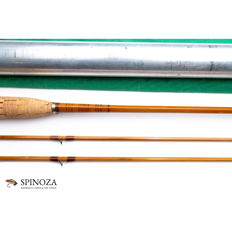 A nice FE Thomas Special bamboo fly rod, 7’6″, 2-piece, 2-tip, and built for a #5 line. Delightful, crisp dry fly action. The rod weighs 3.5 ounces on my scale. The rod appears to be in original condition although the varnish may have been rubbed and polished in the past. The main wraps are brown with a pale green edge at the keeper and male ferrules. 3/7/3/1 signature wraps and three windaways at the male ferrules. Bronze reverse twist snake guides. The step ferrules are polished bright and the tips have the usual long wrap at the top. The grip is 5 1/4″ long with a large cigar profile, and the all-cork seat is 3 1/2″ long. Both have been cleaned, leaving them heavily ridged. The cap and ring are polished and the cap is stamped F.E. Thomas, Special, Bangor, ME and serialized out on the bottom with A545. The rod packs into a green bag and the original aluminum tube with brass fixtures and only about 20% of the original Thomas-Shield decal intact.