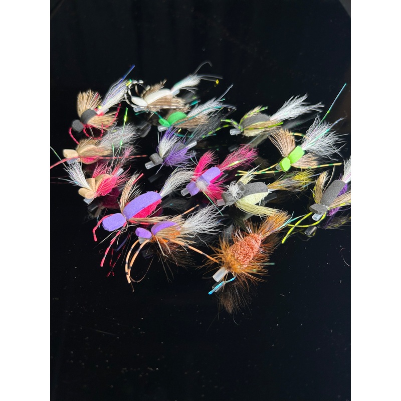 Selection of wake flies for steelhead surface fishing – All neatly stored in our practical clear plastic box.