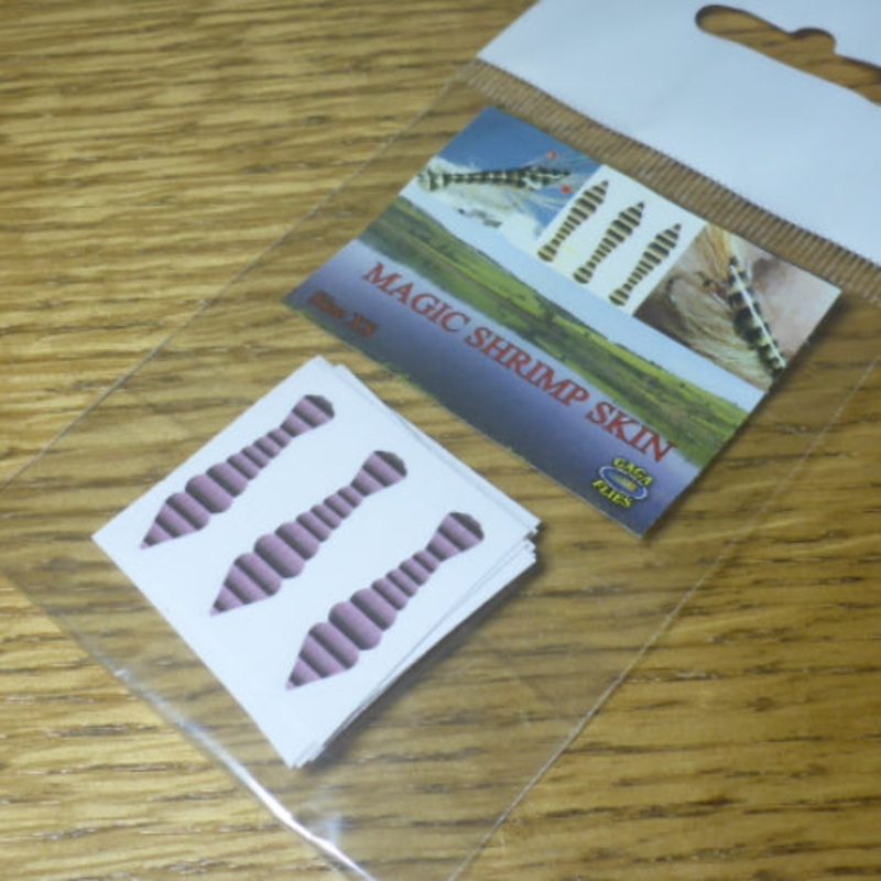 Magic Shrimp Skin is back material for shrimp imitations. Made of thin vinyl and each skin is precutted to shape. Slightly adhesive surface makes placing the skin on the hook easy. Coat with UV glue/varnish for three dimensional look.