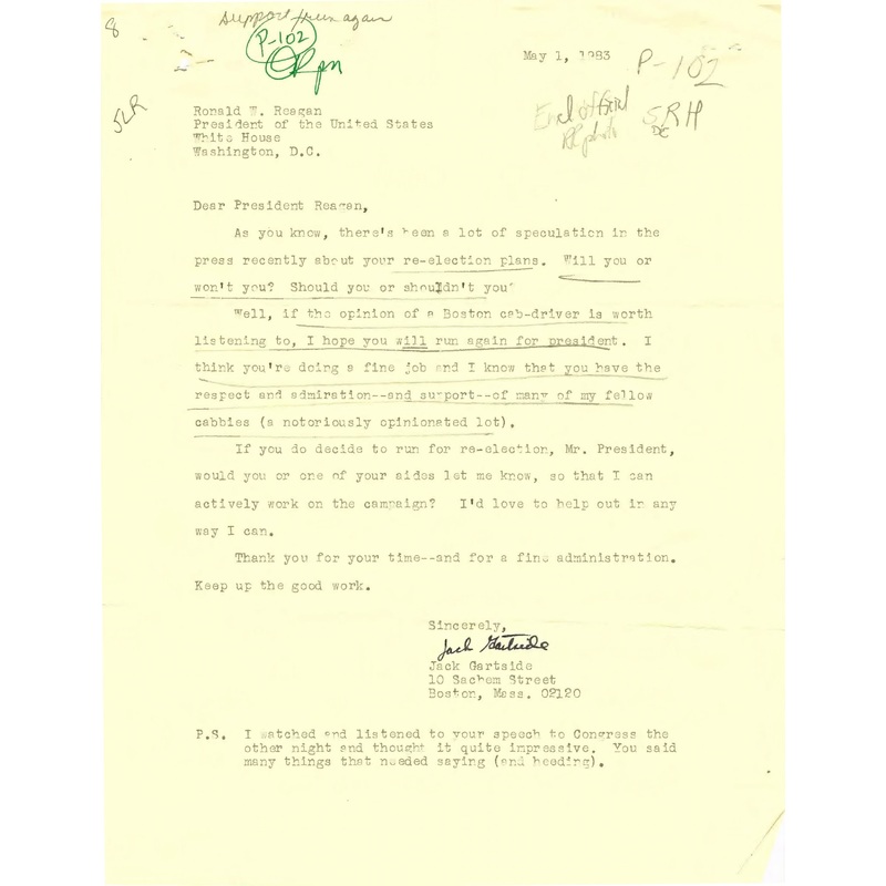 Framed letter from the White House to Jack in response to his inquiry about Reagan running for re-election.