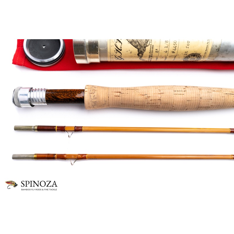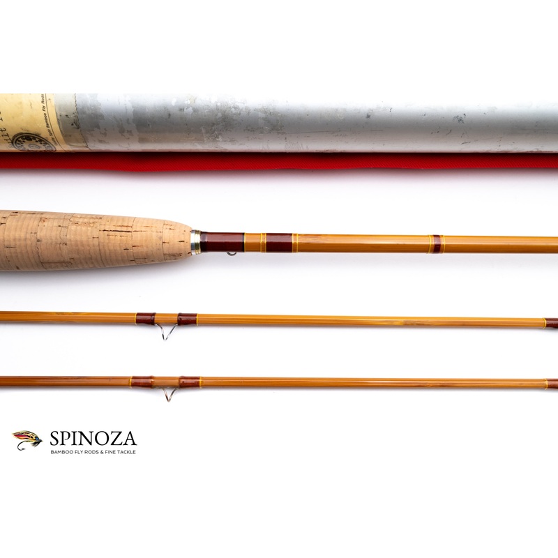A Gary Howells bamboo fly rod, 8′, 2-piece, 2-tip, and built for a #6 line. Serial #4450. This rod was restored by Marcelo Morales, which included building a new tip. The new tip and the butt section have been re-wrapped, though the wrap color is a shade darker than the Howells original and they were also given chrome guides (the original tip has lightly bronzed ones). Nevertheless the restoration work is good quality. The rod weighs 4.2 ounces on my scale. Full flexing medium-fast action. Dark wheatstraw colored cane done in a three up node pattern. The varnish on the original and restored sections is in good condition. Wrapped in brown with yellow tipping (as noted the re-wrapped butt and new tip is done in a darker, slightly more red main wrap color). The ferrules have the characteristic overwrap. The grip is 7 1/4″ long and shaped to a western profile with a hidden pocket cap under the heel. An uplocking aluminum screwlock seat is done over a varnished Zebrawood spacer. The rod packs into a bright red cloth bag and the original tube with Gary’s data sticker affixed to the outside.