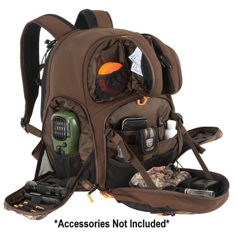 The Gear Fit Pursuit Bruiser Treestand Pack in Brown and Mossy Oak Break-Up Country camo is made for hunting in a treestand. Made from a super soft, quiet material and silent pocket closures that help keep you quiet. Features an easy haul-to-the-top bungee system so you can pull it up to you. The two large side pockets with mesh side panels prevent accessories from dropping to the bottom of your pack. This pack features 1212 cubic inches of carrying capacity.