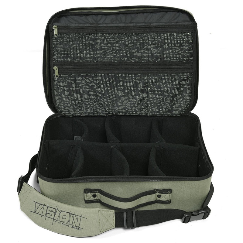 This bag is a real multi-purpose bag for the enthusiastic fly fisherman. It can be used as a spacious reel bag, accommodating a big bunch of differently sized fly reels but thanks to its genius inner wall system you can modify it as you like, according to your needs. In addition to reels you can make a supportive space for your digital SLR or video camera. Or you can use it as a big fly tying bag when travelling. The soft divider gives extra protection when the bag is closed and its numerous zipper pockets keep your small accessories in order and easily accessible. The moulded bottom part is waterproof up to the rivets and stitches, so it can easily be left on the bottom of your boat. Olive green colour scheme.