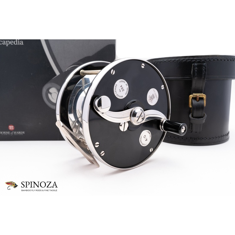 A fine Hardy Cascapedia 4/0 Limited Edition Fly Reel that Hardy introduced in the late 1990’s. This exquisitely finished, and hand-built multiplier reel is number 264 of only 500 made worldwide. This one is made by reelmaker Ian W. Evans as noted on one of the medallions, while the other displays the royal warrant of HRH The Prince of Wales, and the third notes the 4/0 size. RHW. Unfished. All original with box, sleeve, block leather case, booklet, and white gloves! The drum is made from highly polished bar-stock aluminum, the side-plates are polished ebonite, and the rims are stainless steel. The reel seat is brass nickel, and the pillars, drag selector, and check button are finished in nickel silver. Nice smooth drag and the reel features a 1.7/1 multiplier retrieve. The drag selector can be adjusted to seven different levels, and the check button allows for an audible click or silent operation as preferred. The reel comes with the original leather block case, box, and paperwork, including the provided white gloves for handling. A great reel for the Hardy aficionado!