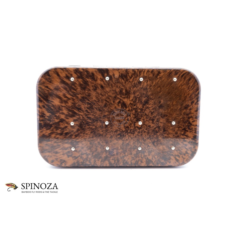 A nice Hardy Neroda salmon fly box in the tortoiseshell color that measures approximately 6 1/4″ x 3 7/8″. This is a 40 clip model and is very clean throughout. There are 40 small featherwing patterns inside. Excellent condition with just very minor cosmetic wear and the box latch functions exactly as it should. A fine example of one of the best boxes ever made.