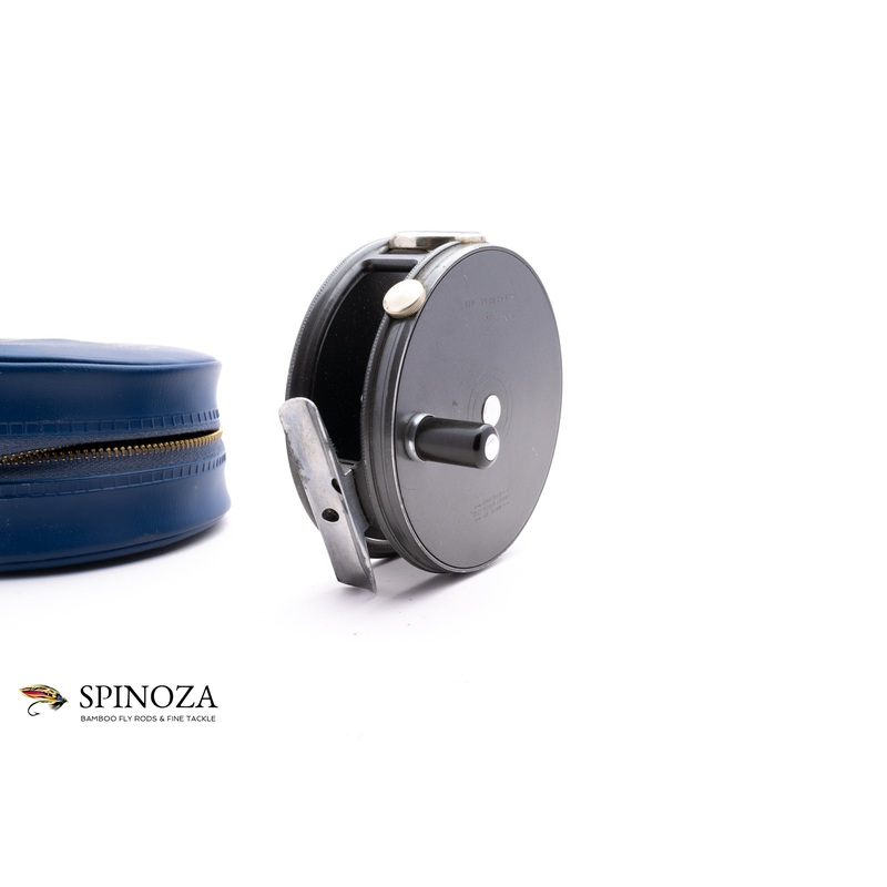 A nice Hardy Perfect fly reel, 3 7/8″ diameter and set up for RHW. Later enamel model. Excellent, lightly used condition with minor cosmetic wear, but no meaningful issues that I could find at all. Very clean. The agate lineguard is pristine. Duplicated Mark II check which is nice and smooth and the tensioner works as it should. Ebonite handle with a smooth alloy foot. The reel packs into a blue vinyl hard zip pouch.