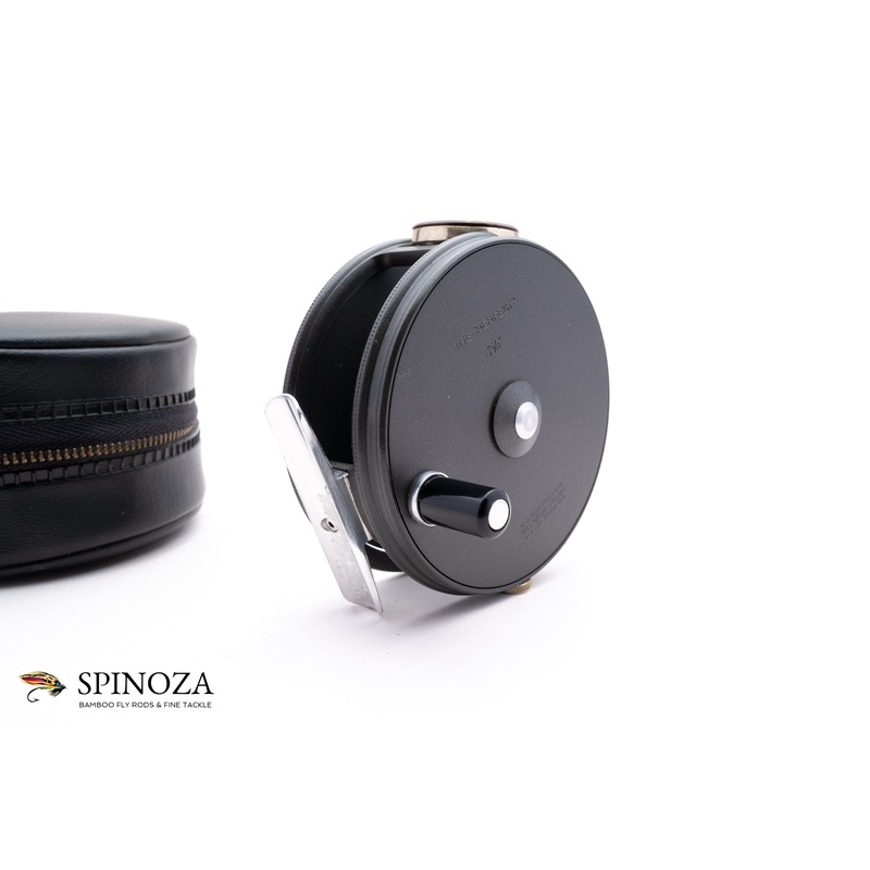 A nice Hardy Perfect 3 5/8″ fly reel. Later model. Set up for RHW. Brown ceramic lineguard. Near mint condition. There are some mounting marks on the reel foot but the rest of the reel is pristine with no signs of having been fished whatsoever. Smooth alloy foot. The click drag works great, the spool is nice and tight, and the tensioner works as it should. The ebonite handle spins freely. The reel packs into a black vinyl Hardy case.