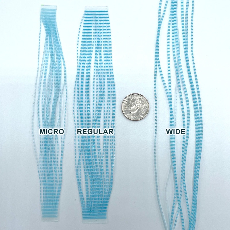 - Wide – 11″ long skirts / 36 legs per pack – Ideal for translucent underbodies. Also great for large predatory species patterns.