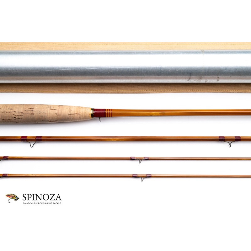 A nice Maxwell Leonard model 50-5 bamboo fly rod, 8′, 3-piece, 2-tips, and built for a #5 line. Serial #8073, dating to early 1980 during the Maxwell period. The rod weighs 4.4 ounces. Moderate use with light grip soiling, some brassing to the inner guides and casting cracks at the ferrule wraps. Medium to fast action. The cane is flamed with small pressed nodes done in a three up configuration. The main wraps are plum with purple and red edges at the keepers and male ferrules. Agate stripper and black snakes. The Leonard step ferrules are all oxidized pewter with 100% of the original oxidation. The grip is 6″ long and shaped to a slim cigar. The tiger Maple seat is a tad bit tight but the slide band will still move. The slide band and cap have a bit of edgewear to the oxidation. The cap is stamped H.L. Leonard Rod Co., The Rod Maker,since 1869. The rod packs into a tan cloth rod bag and sanded aluminum tube with brass appointments.