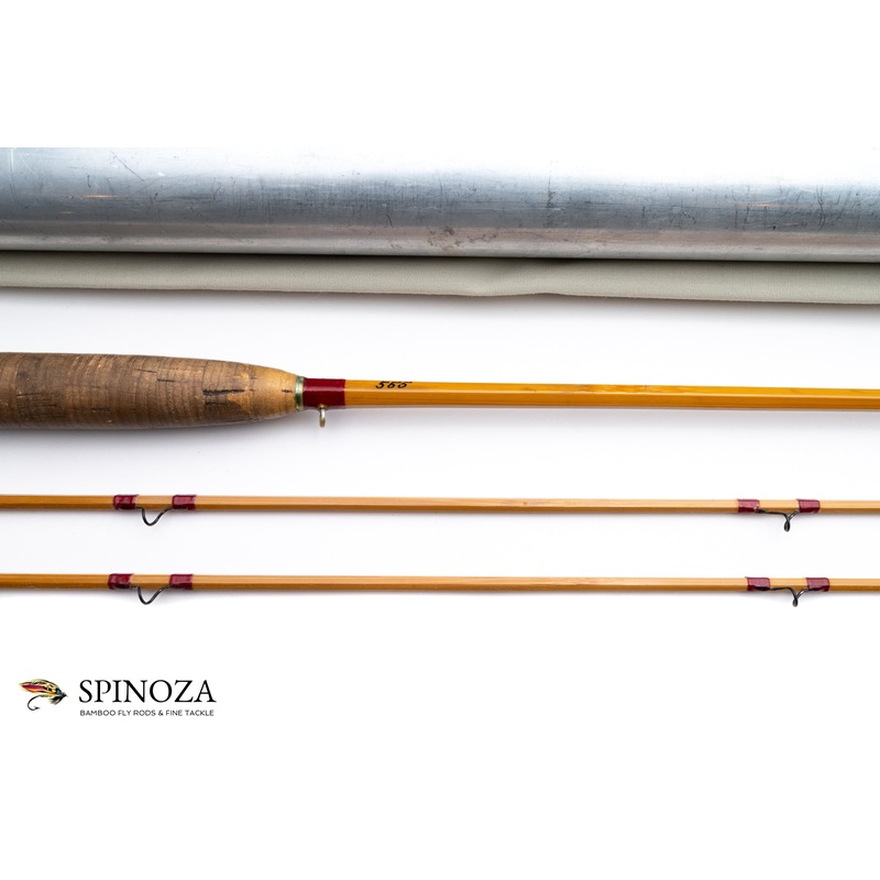 An H.L. Leonard 38-H bamboo fly rod, 7′, 2-piece, 2-tip, and built for a #4 line. Serial #555 (which I believe dates this to 1968). Normally I would list this as a #4 but it seems a bit slower than most of the 38-H’s I have felt and I could see using a #3. 2.8 ounces on my scale. Used condition with a well-tanned grip and faint casting cracks at the ferrules wraps. The reel seat has some cosmetic issues. The ferrules are tight and the rod is straight. The shaft varnish and wraps are very good with a finish typical of the period. Wheatstraw color cane in three-up node pattern. 326 red wraps. Carbide stripper with black snakes with some brassing to the inner guides. The step ferrules are polished. The grip is 5″ long and shaped to a medium cigar profile. The previous owner has written on the grip (in pencil I think) H.L.L. 38-H 2 7/8 Butternut slide-band seat. The wood has some dark stains and a small amount of rub off on the wood. None of these affect the function of the seat. The butt cap has been removed at some point having received a sizable ding in an attempt to drive out the pin. The cap will rock slightly but the pin holds it in place. The bottom of the Leonard stamp has been polished out of existence. Original bag and tube.