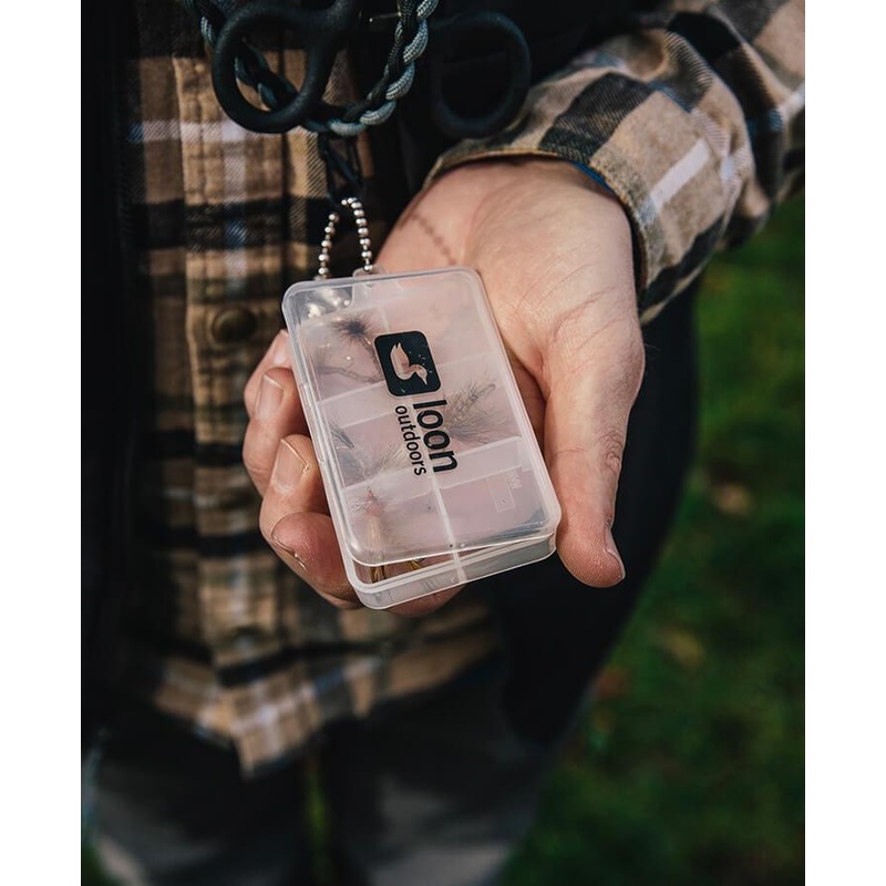 Six adjustable compartments keep the days hot flies close at hand. Attachment chain included.