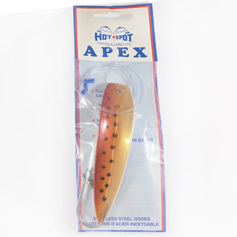 Apex r en sked i plast tillverkad av det Kanada-baserade fretaget Hot Spot. Tack vare formen och materialet kan betet trollas i mnga olika farter. Det kan till och med “jiggas” hem. En riktig klassiker som tagit Rding, ring, Lax, Kanadarding och till och med Gs i svenska vatten.