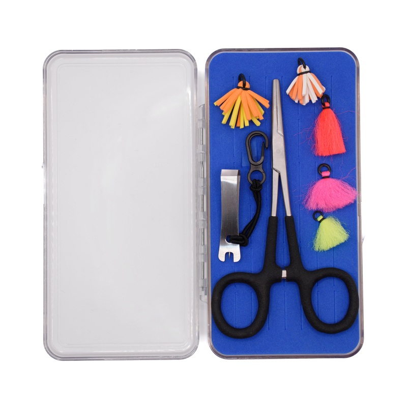 Basic Indicator Kit, Contains, 5 Indicators, three yarn and two foam indicators. Stainless Foam Grip Forceps and Stainless nippers. The blue foam insert is really a slotted pad that you can use as a fly box. The pad has 35 slots for your favorite patterns. Pictured Flies not included.