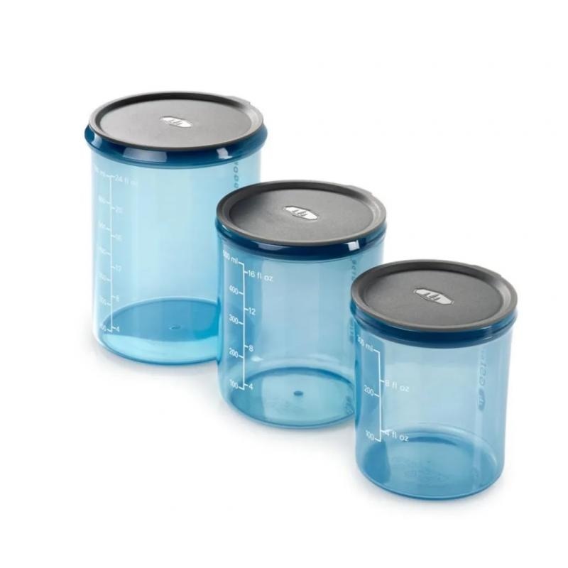 Alle tre er produsert i resirkulerbar polypropylen. Matbeholderne er i tre ulike strrelser: 355 ml, 473 ml og 710 ml. De har mlestreker trykt p (ml og fl.oz.). Alle tre har tette lokk. De to minste fr plass i den strste beholderen, som har strrelse: 104 x 104 x 135 mm.
