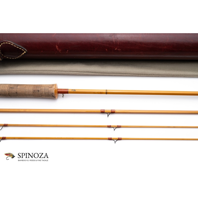 A nice Jim Hidy bamboo fly rod, 7’3″, 3-piece, 2-tip and built for a #3 line. Serial #5205H3. The rod weighs 3.6 ounces on my scale. Moderate used condition. Semi parabolic action. Blonde cane done in a three up node pattern configuration on the butt and mid and a spiral pattern on the tips. The main wraps are light brown with a black edge at the keeper and black halfway on the ferrule wraps. Carbide stripper and black snakes with a small bit of wear to the inner guides. Very light coat of varnish. The ferrules are truncated swiss style and oxidized gray. No ferrule plugs. The grip is 6 1/8″ long and turned to a modified full wells profile. Oxidized cap and ring reel seat over a curly maple spacer. The rod is straight and the ferrule fits are good. The rod packs into a tan cloth bag and a Holland leather case.