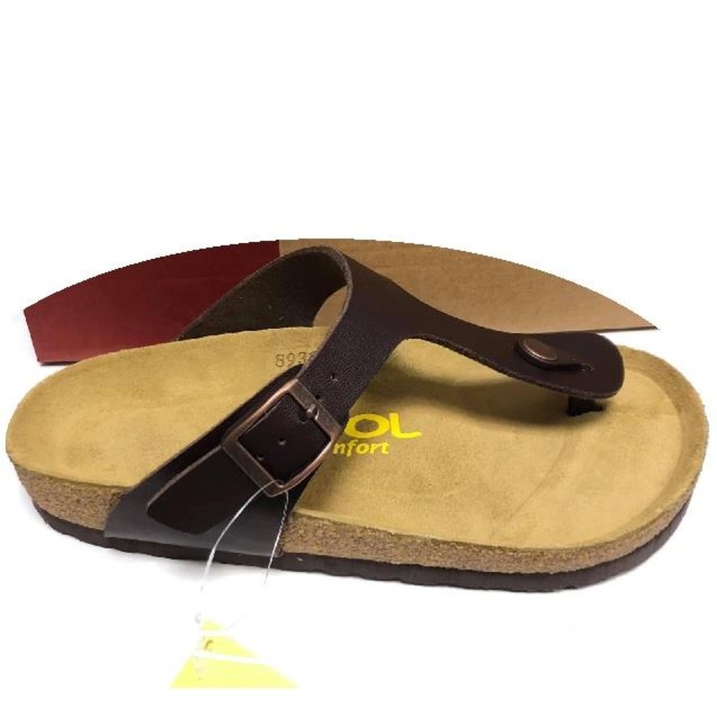 Features a upper leather upper and a cork suede foot bed with adjustable straps.