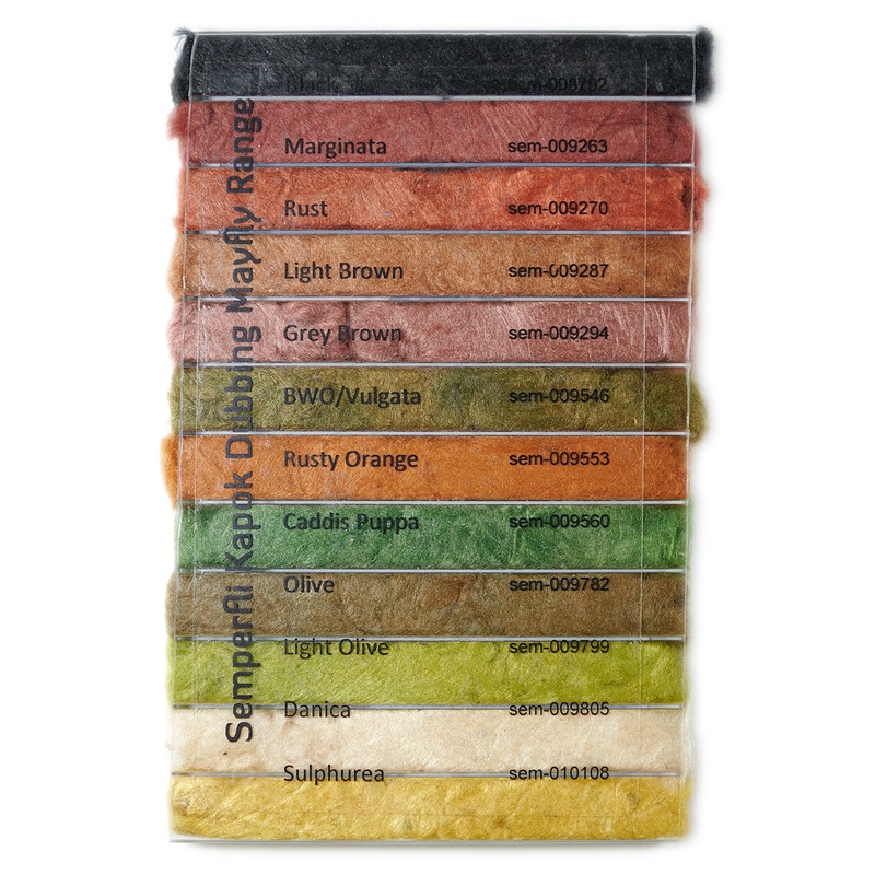 Traditionally Kapok is very difficult to dye however the team at Semperfli have been working with computer based dying machinery which has enabled it to bulk dye Kapok Dry Fly Dubbing Mayfly Dispenser with repeatable colours every time. With Kapok Dry Fly Dubbing Mayfly Dispenser buoyancy is lost slowly, tests have left it for days in test baths and it very slowly over days absorbs water.