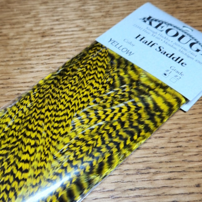 The Keough Half Saddle Number #1 Grade in Grizzly are a great way to get yourself loads of dry fly feathers in a range of sizes. Of course, the natural grizzly hackle is probably the most used colour in dry fly patterns, but there are plenty of options for great looking flies with dyed grizzly colours as offered with these saddles. These dry fly half saddles offer a bigger range of feather sizes to most genetic saddles. You get a lot of feathers around the #10 #14 size range. But, theres also smaller and larger feathers in these saddles as well. The Keough Grizzly Half Saddle in the Number #1 Grade doesnt offer as many feathers as the full Number #1 Grade saddle, obviously, but is more economical.