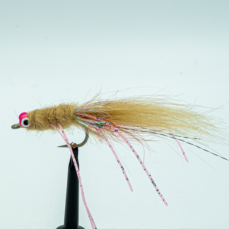 Built on a strong #4 hook and tied in proven olive and tan, this little mud ninja is a top-tier choice for redfish, bonefish, and other picky flats dwellers whove seen every badly tied shrimp on the planet. Pink barred legs, hot-colored dumbbell eyes, a trimmed head that breathes, and a tail that says, Come get it, you crustacean-chompin bastard.